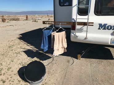 The Gum's AKA Dwayne had an idea for an outdoor clothes hanging rack that won't blow away. It is designed to attach interlocked to an RV ladder. No tools or brackets needed to use! D stained the piece and added the dowels on the fly and the Lazy i simply cut & "routed" some wood. Good collaboration. See photos below. Darla Jean can rest assured her unmentionables will stay unmentionable & out of the sand!